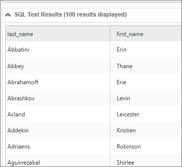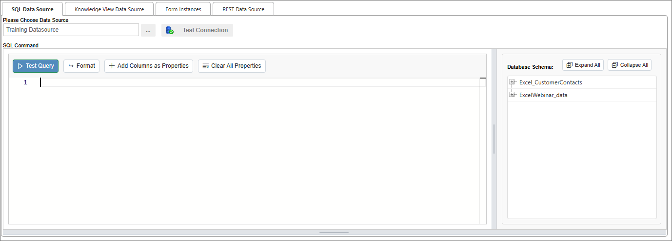 The left pane of the Monaco editor contains the code window into which you can place your SQL statement, while the right pane displays a Treeview of all the table that are accessible from the SQL data source you configure. In the example above, the Training Datasource enables access to two tables from the internal User Database. Between the two panes, and along the bottom of both panes, resizable borders enable you to click and drag to change the relative widths of the two panes, or to change the vertical height of the editor, respectively.