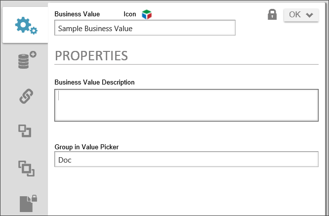 The Create Business Value screen will appear. Enter a name in the Business Value Name field, then click the OK button to save the new Business Value and open the configuration screen.