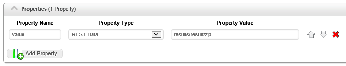 The properties returned can be ordered by using the UP and Down arrow icons, and deleted by clicking the red "X" icon.