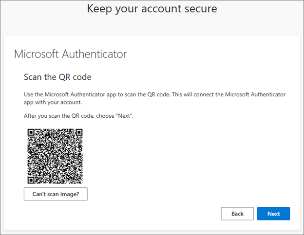 The next screen will notify you that you’ll need to set up a new account in Microsoft authenticator. To do this, we’ll need to scan a unique QR code. Click the Next button to display the QR code.