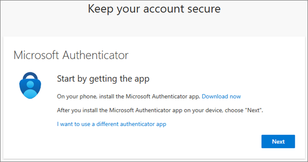 The next screen is an information screen that has a link to enable you to download the authenticator app. In most cases, you won’t do this, because you’ll be using a desktop or laptop computer instead of a mobile device. As mentioned previously, you should already have downloaded the Microsoft Authenticator app to your mobile device.