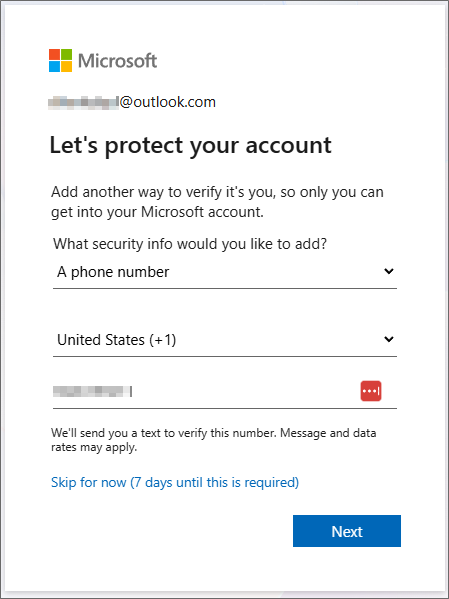 Because your email address is from a domain that Microsoft controls, you’ll be asked to provide an alternative contact method, in addition to your email address. While you can initially skip this step, you’ll be required to provide this information within seven days. Since that’s the case, we’ll go ahead and enter it now. You have the option of using either an alternative email address, or a mobile phone number as the alternative for verification. In this example, we’ll provide a mobile phone number, as that’s the most widely used option.