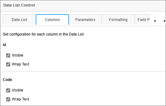 The Columns tab of the control properties enables you to specify the columns you which to display in the Data List control.