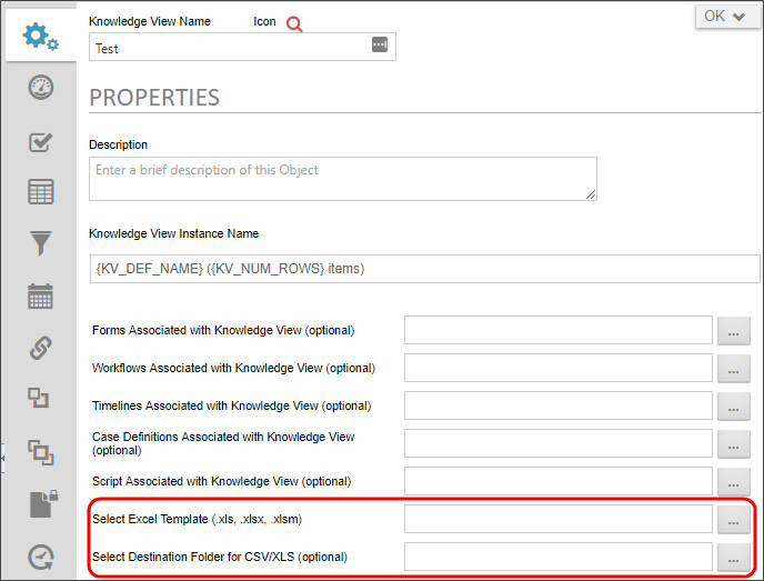 Before a Knowledge View can be exported to an Excel file, an Excel template file located in the Content List must be linked to the Knowledge View. To link to an Excel template file, set the Select Excel Template property.