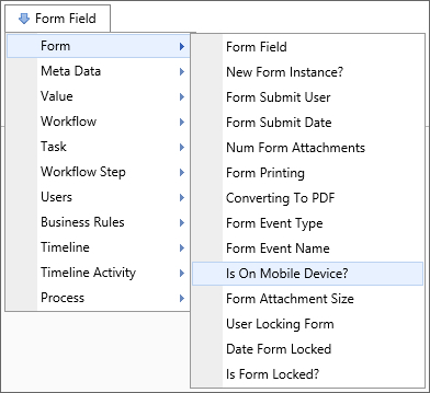 A Form Field system variable will return the value of a specified form field. The data will be drawn from the active instance of the Form. When the form field name is the name of a column in an array, this system variable will return a comma separated listed of the values of all the non-empty fields in that column. To include empty values in that list, set the optional parameter KeepEmptyRows to true.